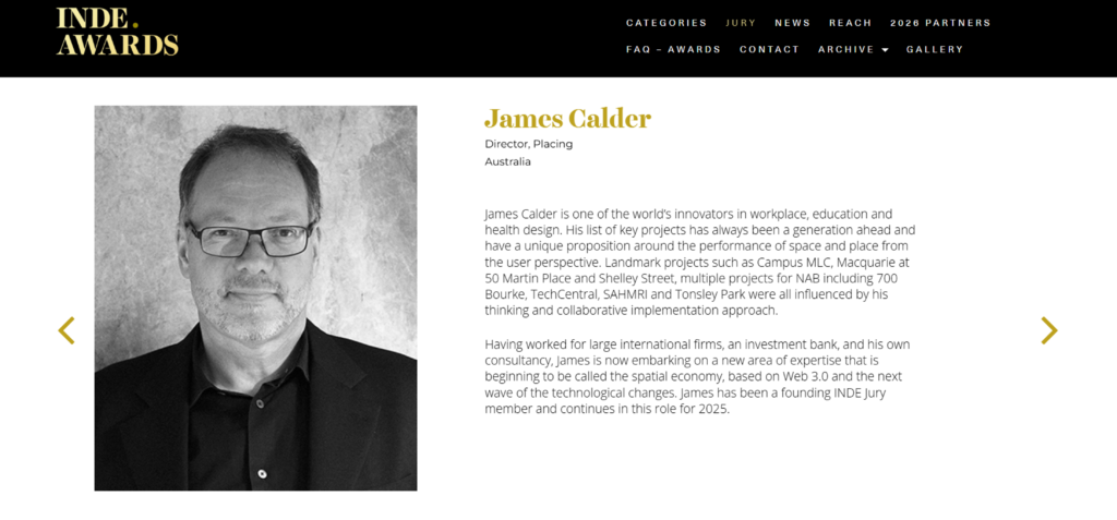 INDE. Awards 2026 カルダー・コンサルタンツ創立者のジェームス・カルダーが今年もINDE. Awardsの審査員を務めることになりました。 INDE. Awardsは、インド太平洋地域で最も革新的な建築物、空間、オブジェ、プロポーザル、人々を顕彰する、歴史と権威ある取り組みです。